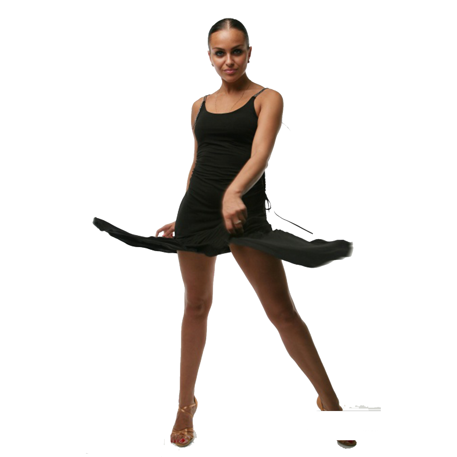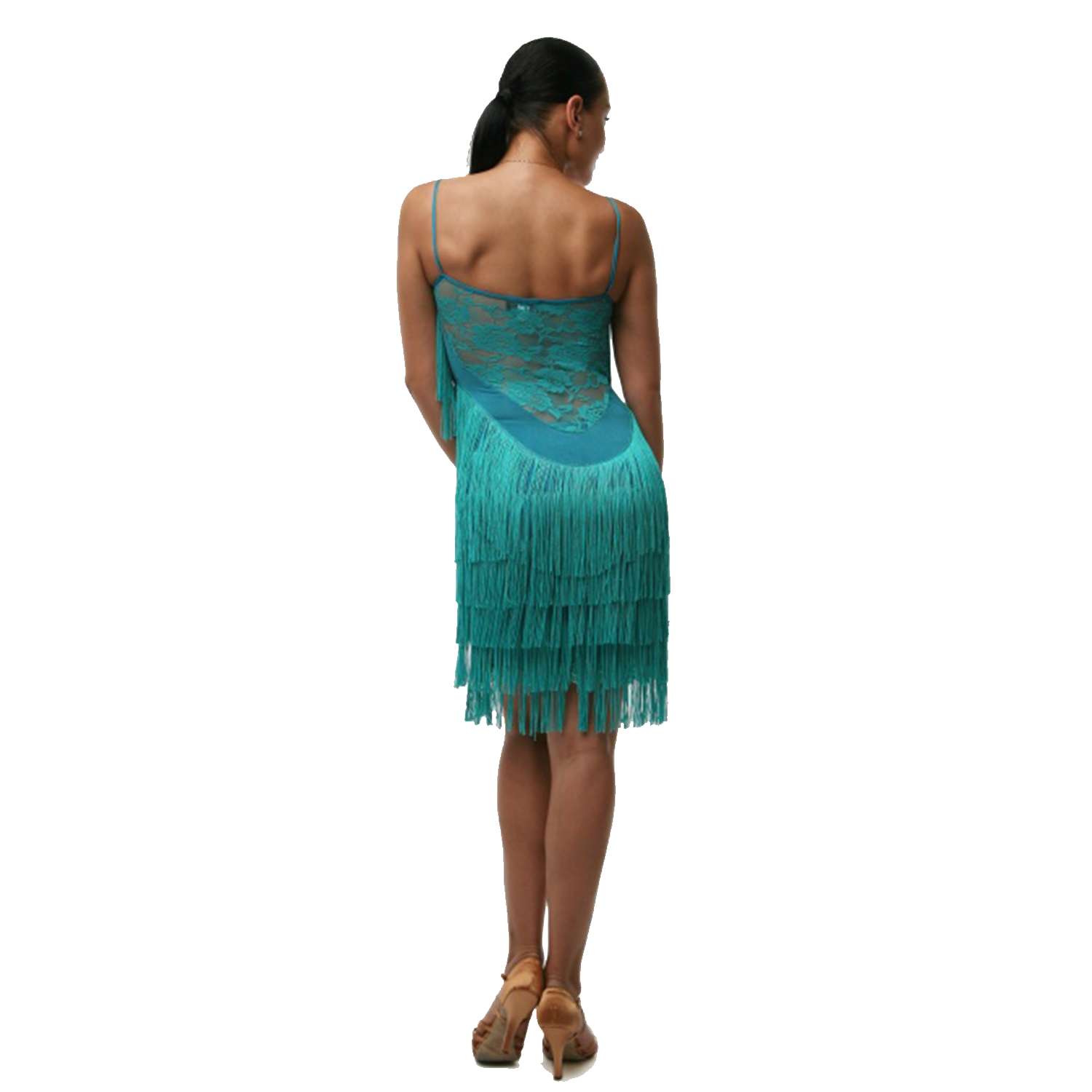 Платье на тонких бретелях, с разрезиками на юбке по бокам, кружевной окантовкой по низу юбки, с бахромой, и украшеное гипюром вырез на спинке для Латиноамериканской программы. Россия